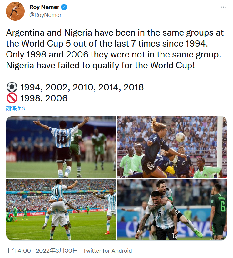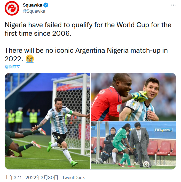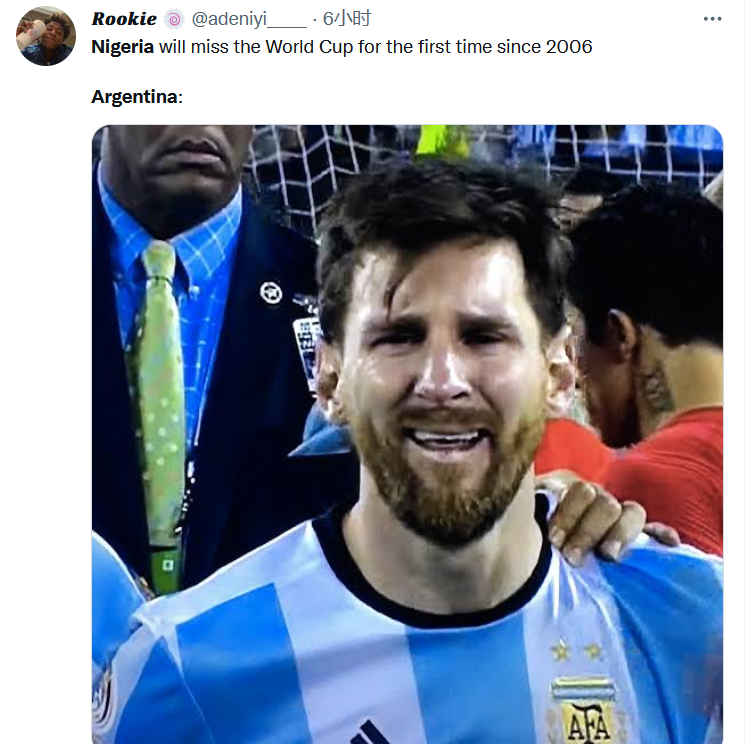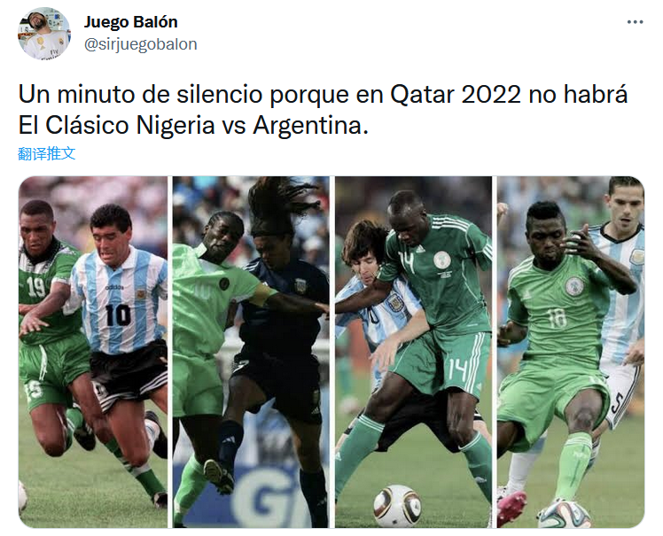 “2022 年不会有标志性的阿根廷VS尼日利亚了”、“尼日利亚:阿根廷别为我哭泣”……