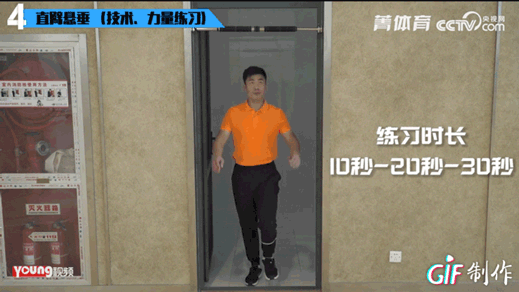 扶墙压肩,每组4×8拍 动态悬垂抬腿,每组8-10次 静态悬垂抬腿,每组10秒-15秒-20秒 屈臂悬垂,每组10秒-15秒-20秒 屈臂悬垂慢下,每组5秒 俯卧撑,每组10-15次 |