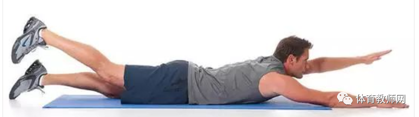 从趴在地上开始,此时你的四肢要向外伸展。将头、左臂和右腿抬离地面约5英寸(约12.7cm)。保持3拍后放下。头、右臂和左腿重复。每边各做10次。