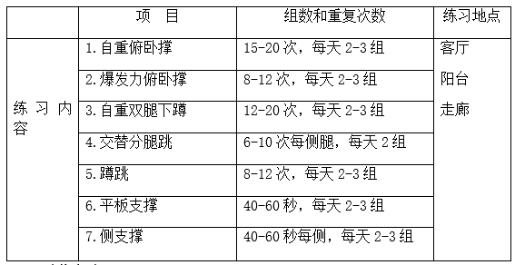 5.持之以恒,坚持每天锻炼不少于一小时,每次锻炼时间不少于40分钟。指南的内容根据各家的场地条件和各自的身体情况适当选择。
