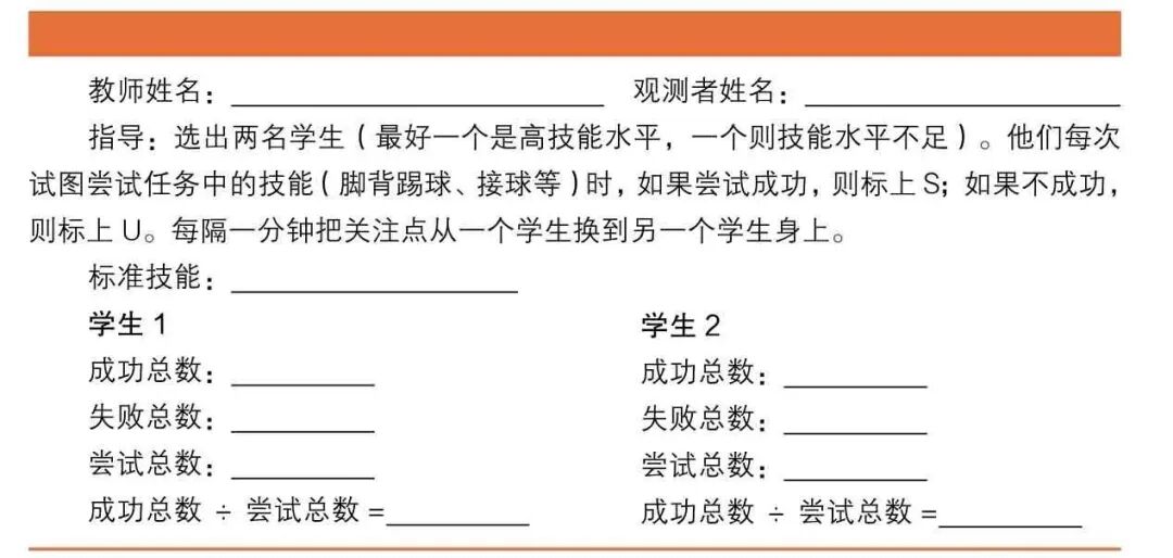 确定学生成功率的一个方法是使用表格提供客观证据(见分析练习机会及成功率表格)。这种表格使用起来很容易,有些学生使用得相当好。然而,使用容易计算的练习次数时最有效,强调排球投掷、接球、脚击球和发球的课程是最理想的。通过计算一个技能水平不足和一个高技能水平学生的成功和失败次数,教师可以合理地估算出学生的成功率。不过要记住一点,80%是一个普通的目标,可能对有些学生来说并不合适。再强调一次,去观察和了解学生。如果一个学生经常走神,这说明这个成功率并不是最佳的,这个任务不是太难就是太容易了。