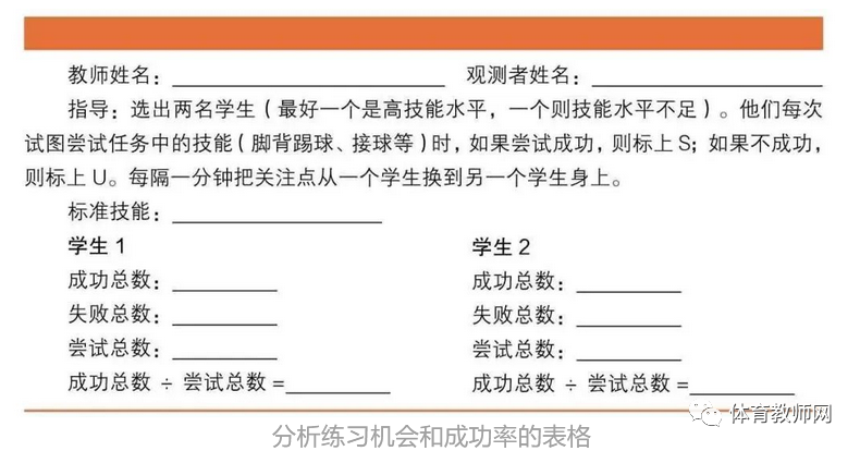 然而,使用容易计算的练习次数时最有效,强调排球投掷、接球、脚击球和发球的课程是最理想的。通过计算一个技能水平不足和一个高技能水平学生的成功和失败次数,教师可以合理地估算出学生的成功率。不过要记住一点,80%是一个普通的目标,可能对有些学生来说并不合适。再强调一次,去观察和了解学生。如果一个学生经常走神,这说明这个成功率并不是最佳的,这个任务不是太难就是太容易了。