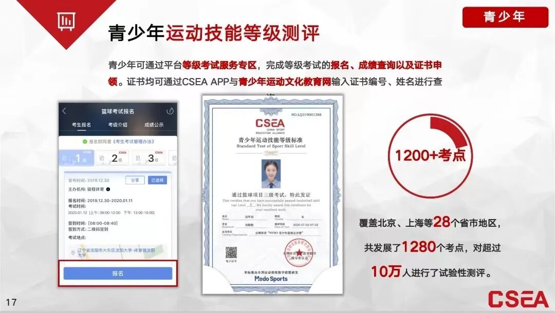 据CSEA海南省运营中心负责人张万祥介绍,CSEA海南省运营中心主推篮球、网球、游泳、足球等8个青少年运动项目的等级测评。海南从2018年已经开始进行篮球等级测试,本次已是第8次技能考核测评,考核各项工作日渐成熟。他表示:“运营中心的成立不仅为青少年运动技能增长提供客观评价依据,当青少年的级别达到4—6级后便可参加全国赛,为他们提供更大的赛场,增强青少年参与体育竞赛的获得感。运营中心也将开展对各体育机构服务质量的评测,为行业健康发展提供一个规范的标准,对体育培训机构有助推和指导作用。”