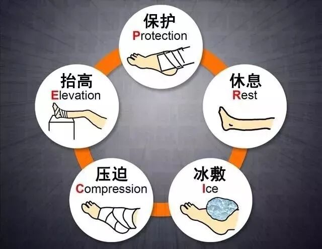 保护固定(Protection)、休息制动(Rest)、冰敷患处(Ice)、加压包扎(Compression)、抬高患肢(Elevation)。