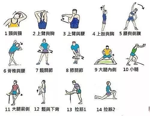 运动前的热身活动很关键,不同运动所需的肌肉群不同,因此需应进行不同的预热活动。