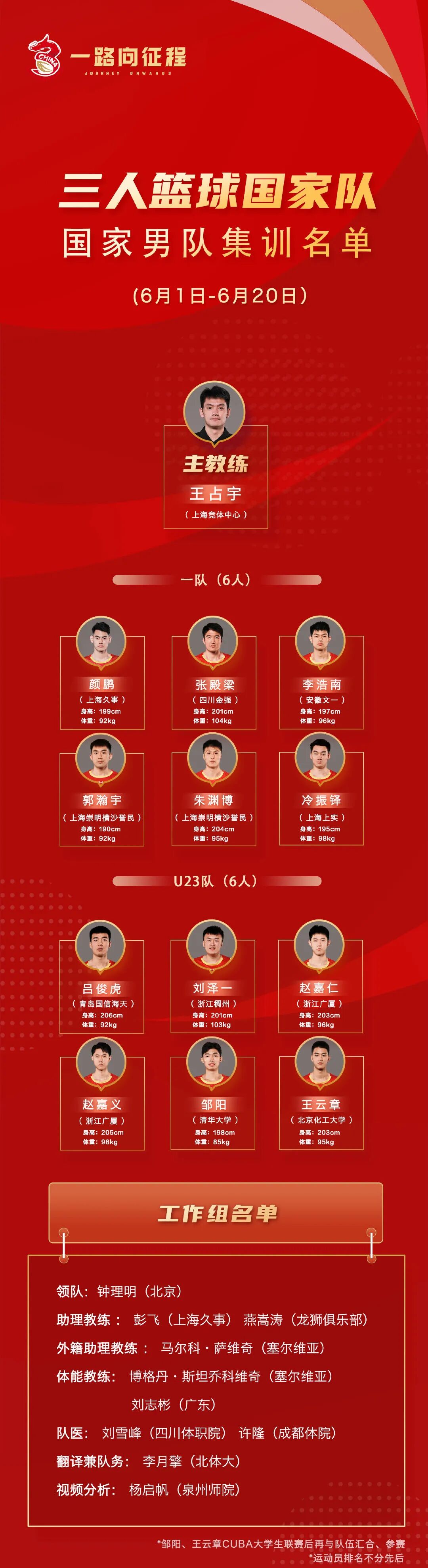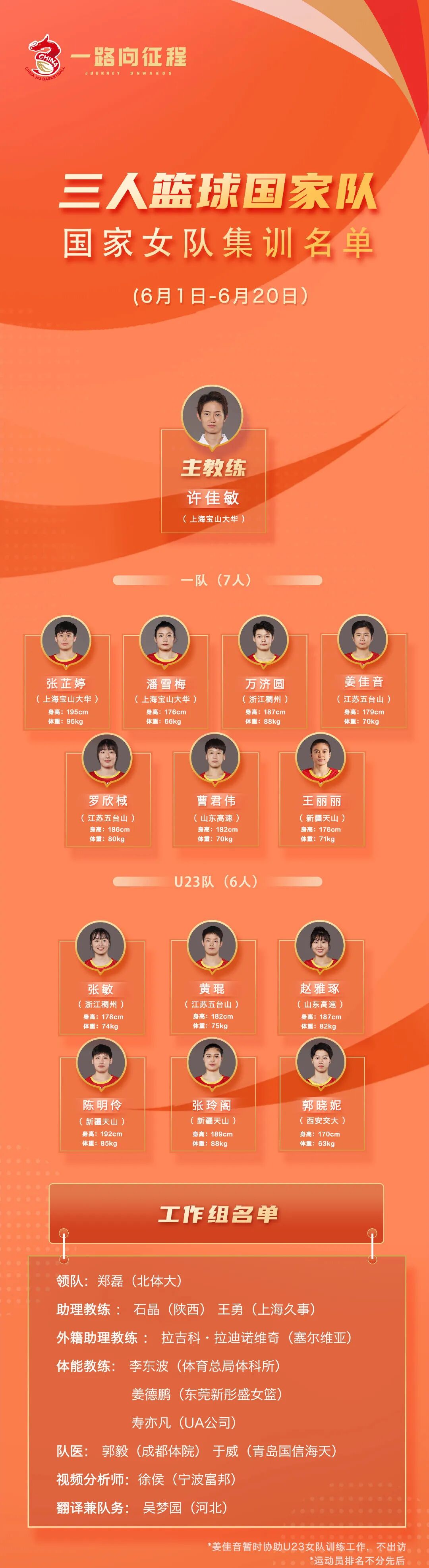 北京时间6月8日,中国篮协公布了三人篮球国家队集训名单,主教练分别由来自上海竞体中心的王占宇指导和来自上海宝山大学的许佳敏指导担任。