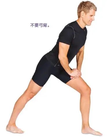 【1】一只脚在前一只脚在后站立,双腿在矢状面与髋部同宽,双脚朝前。弯曲前膝并将双手放在前面的大腿上。