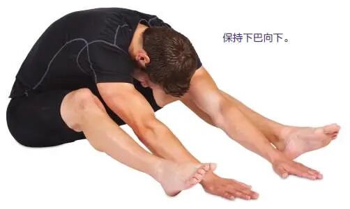 【1】坐在地板上,双膝弯曲,双腿宽放。将胸部降至双腿之间,并面向地板方向。双手置于地板上向前倾。