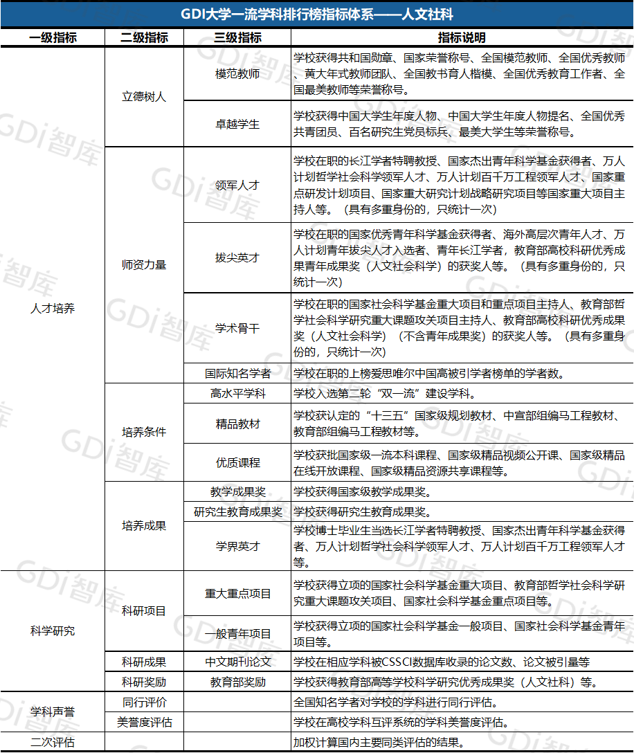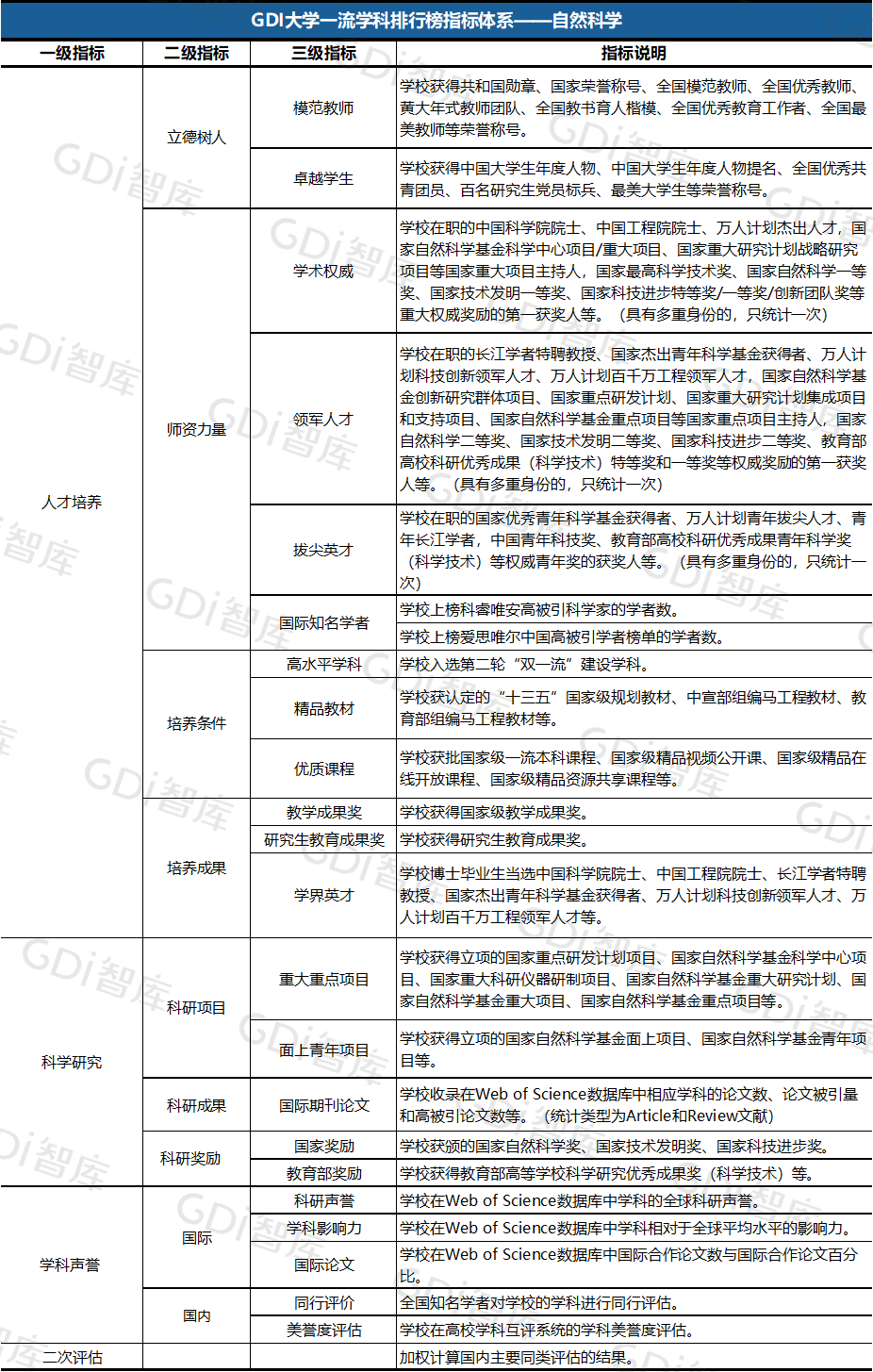“GDI大学一流学科排行榜(2022)”评价体系把人才培养放在首位,注重多元评价,突出贡献、创新、质量和成效,构建“人才培养”“科学研究”“学科声誉”“二次评估”四维评价体系。