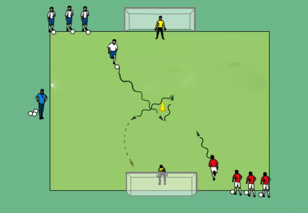 如图所示,2名球员同时围绕中间标志桶运球,然后射门。