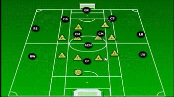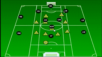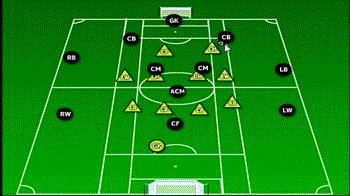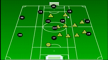 相比于2-0-2阵型,金字塔阵更有防守倾向。阵型里设置了一个完全的前锋和一个随时参与攻防两端的中场球员。