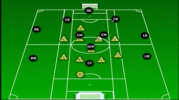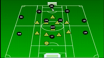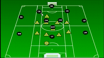 此阵型可谓攻守平衡,同时设置了一个专职“站桩中锋”和一个专职后卫“清道夫”。两个中场球员兼具攻防的职能,这样就能保证在任何时候帮助球队转换到最需要的阵型状态。