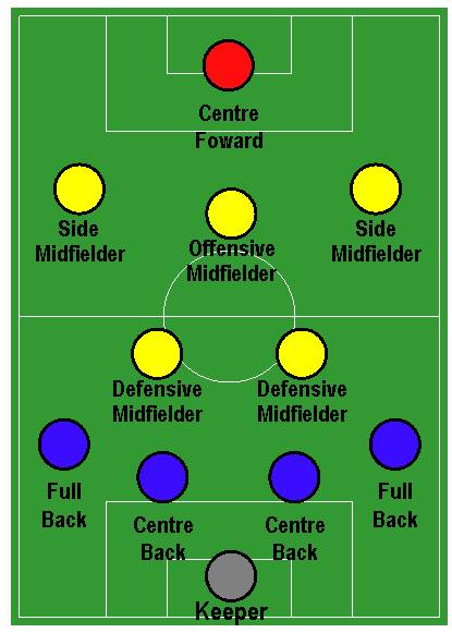 3)两个中场球员需要体能好,机动性强,尤其是需要保持默契的配合(例如,如果其中一人到前场进攻时,另一人应该知道这种时候得留下来保证防守。)