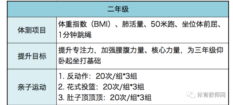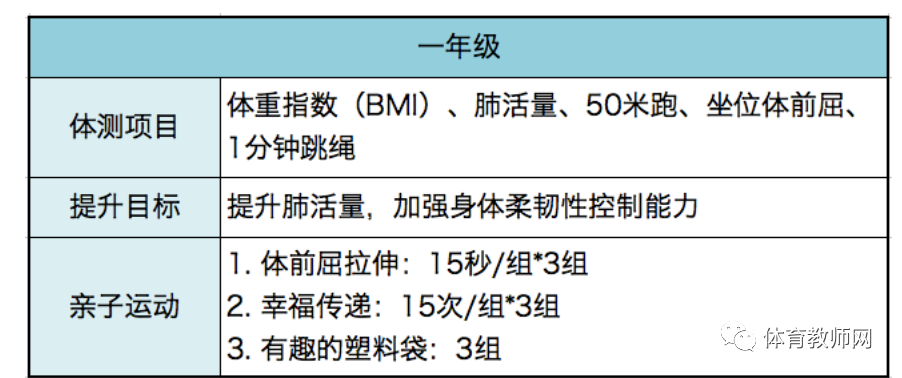 目标:各省在中小学生体质健康管理中作出明确要求,大力推广家庭体育锻炼活动。家长可结合各年级体测项目要求及孩子体测薄弱项,通过亲子运动方式,多陪伴,多互动,以此来激发孩子的运动兴趣,培养运动习惯,增进亲子关系,科学有效地促进孩子身心健康发展。体育教师网。