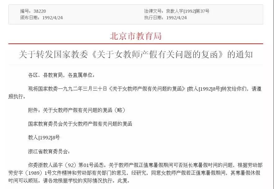 北京市1992年就转发了原国家教委《关于女教师产假有关问题的复函》。