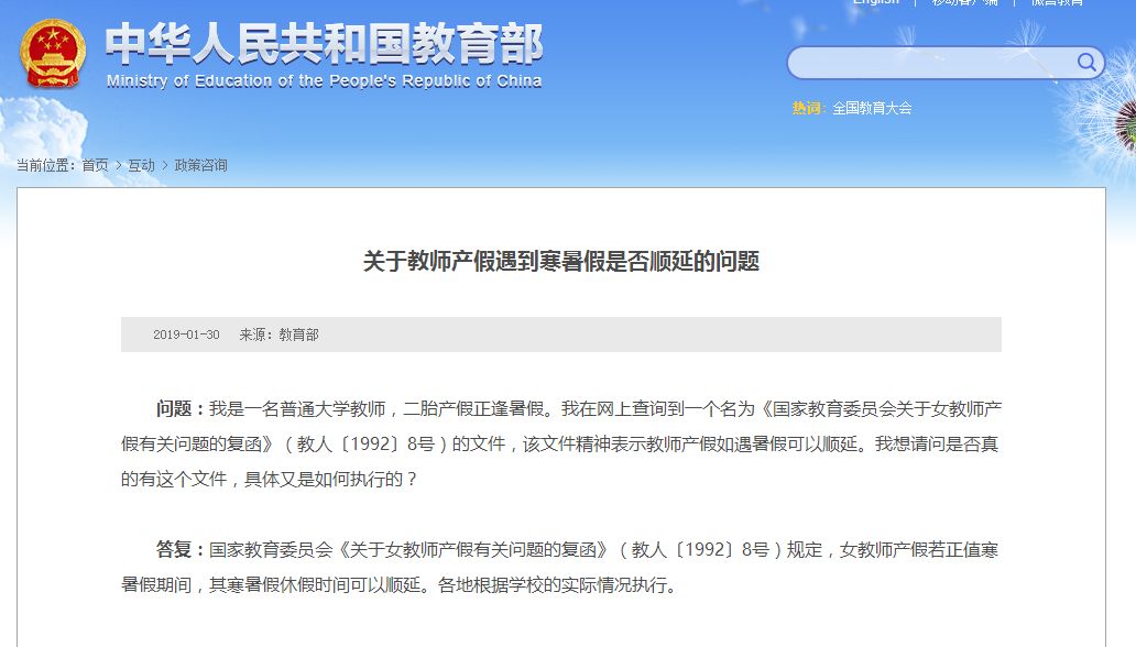 你发现了吗?老师的产假特别容易和寒暑假交叉重叠。有一名教师网友向国家教育部咨询:自己二胎刚好赶上暑假,暑假是否顺延,如何执行?