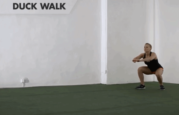 鸭子步前后行走:两脚窄距站立后下蹲,下蹲至髋关节低于膝关节的角度,使用前脚掌进行向前的小步走(一定要小步哦)。