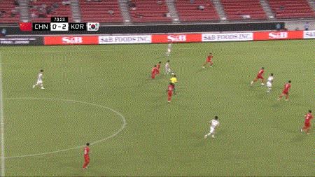 第80分钟,韩国队通过中场一次较为简单的进攻攻破了国足大门,曹圭成接队友直塞后扛开了国足归化球员蒋光太的防守形成单刀,面对韩佳奇推射得手,将场上比分扩大为3-0。