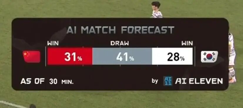 值得一提的是,本届东亚杯转播中引进了AI技术实时预测比赛结果,在30分钟时AI给出的预测现实中国队的胜率为31%高于韩国的28%。