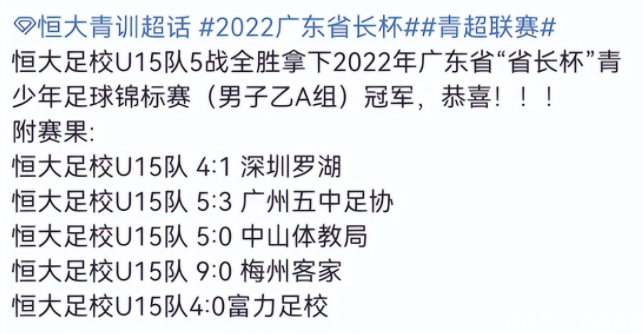 在2022年5月份的广东省长杯(广东省内最高水平的青少年足球赛)赛场上,恒大足校U15队以五战全胜的成绩夺得男子乙A组冠军,他们分别以4比1战胜深圳罗湖、5比3战胜广州五中足协、5比0大胜中山体教局、9比0横扫梅州客家,4比0完胜富力足校。