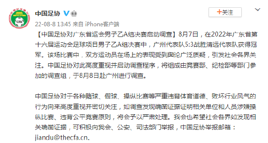 8月7日,中国足协宣布,这场广东省运会足球决赛中,双方运动员在场上的表现受到舆论广泛质疑,引发社会各界关注。中国足协对此高度重视并启动调查程序,将组成由竞赛部、纪检部等部门参加的调查组,于8月8日赴广州进行调查。