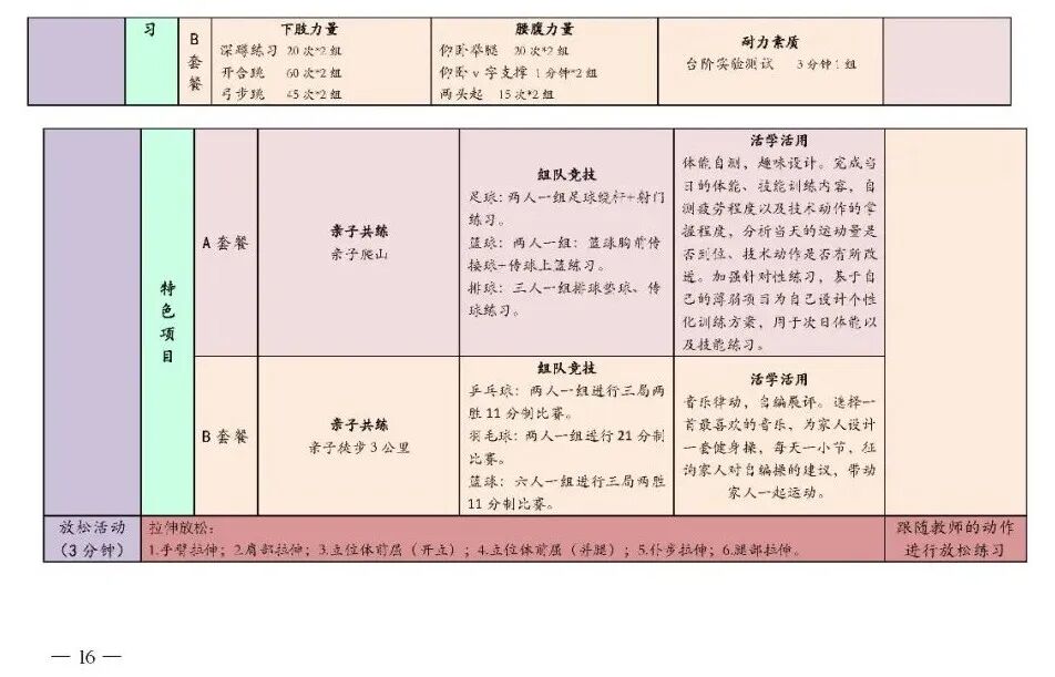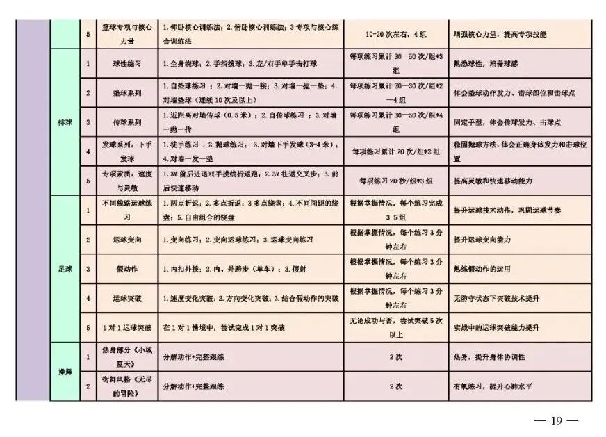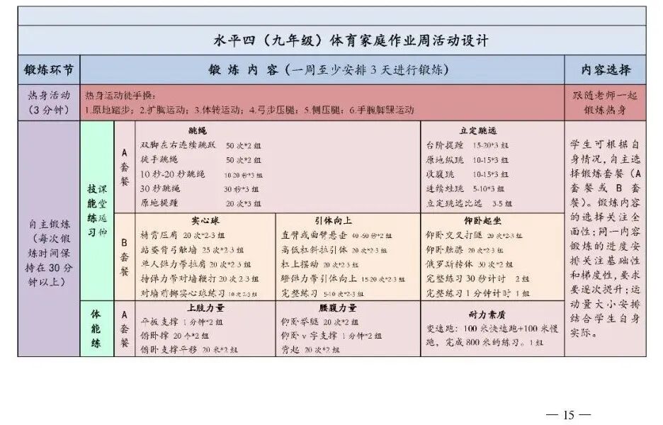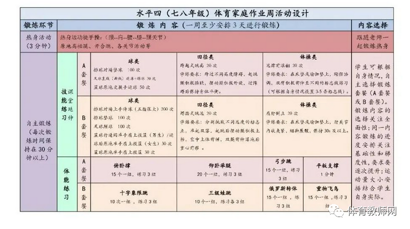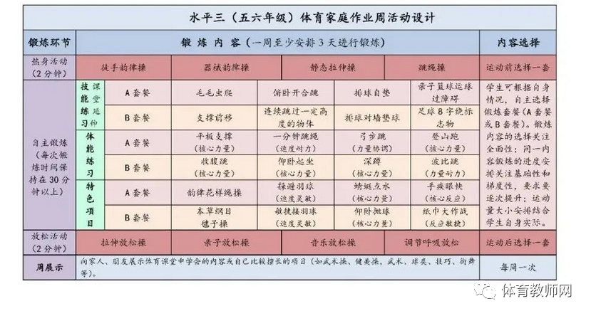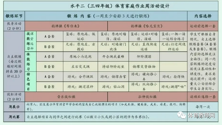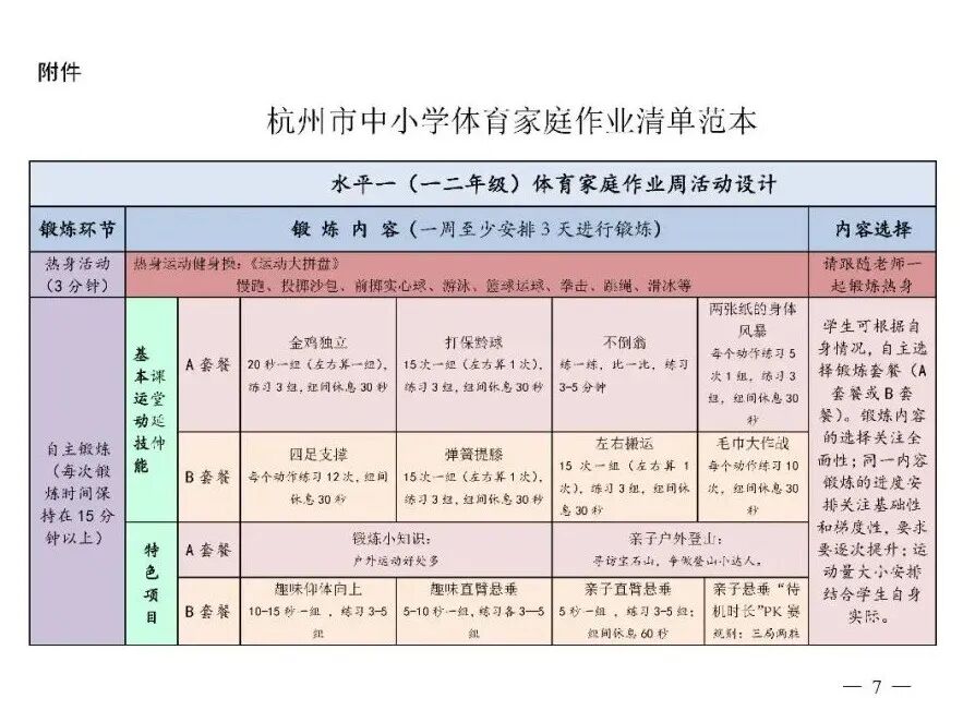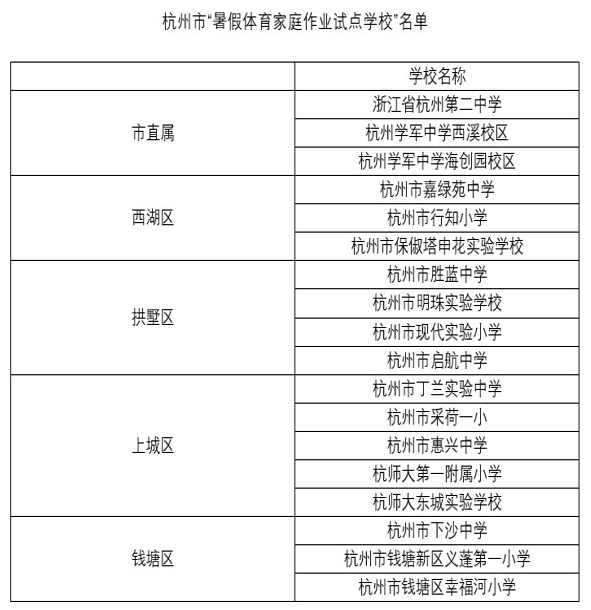 8月杭州市教育局印发《杭州市中小学体育家庭作业设计指引》(以下简称《指引》)的通知,针对小学低段、小学高段、初中、高中四个不同年级段,提出不同的建议,旨在于全面推进青少年掌握1-2项运动项目,促成家校社一体化学校体育工作的开展,全面改善青少年体质健康水平。