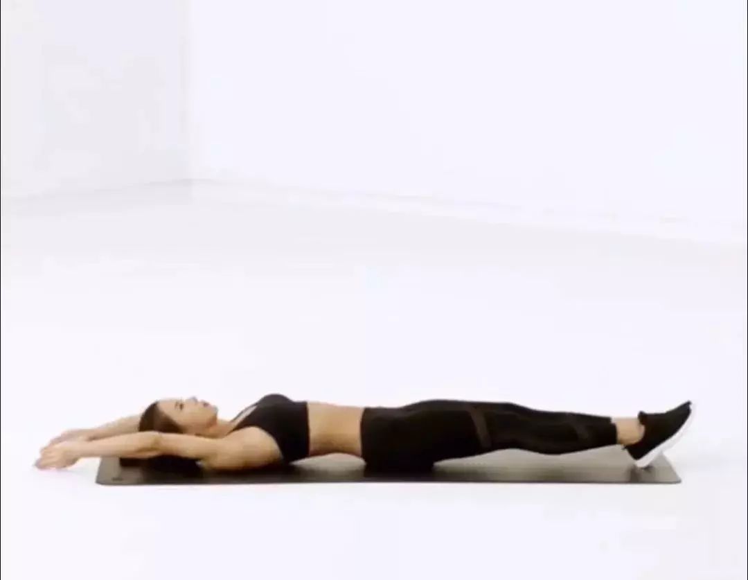 ●躺于垫上,手臂伸直放于头部两侧,腹肌发力起身。
