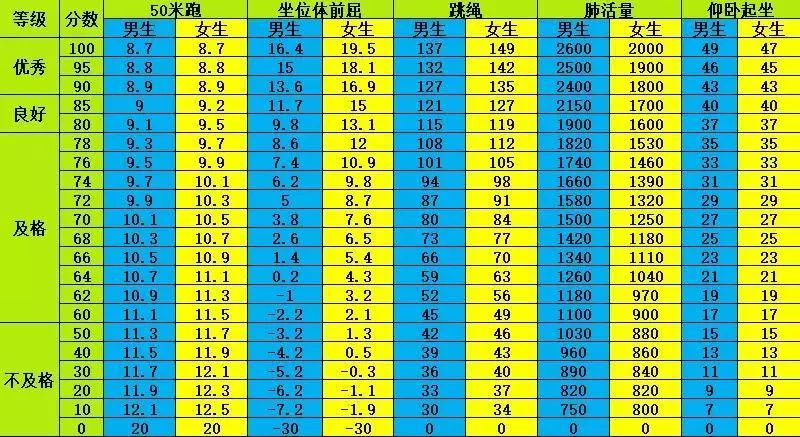 五六年级学生:肺活量 50米跑 坐位体前屈 一分钟跳绳 仰卧起坐 50米*8往返跑
