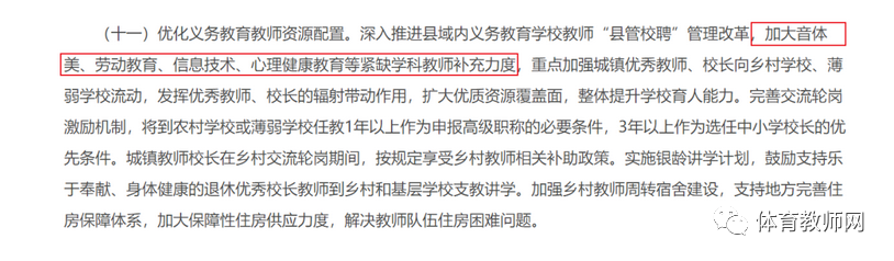 各地要加大力度配齐中小学体育教师、补充美育教师,未配齐的地区应每年划出一定比例用于招聘体育、美育教师。