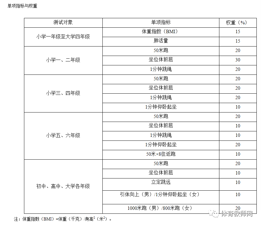 5.小学、初中、高中、大学各组别的测试指标均为必测指标。其中,身体形态类中的身高、体重,身体机能类中的肺活量,以及身体素质类中的50米跑、坐位体前屈为各年级学生共性指标。
