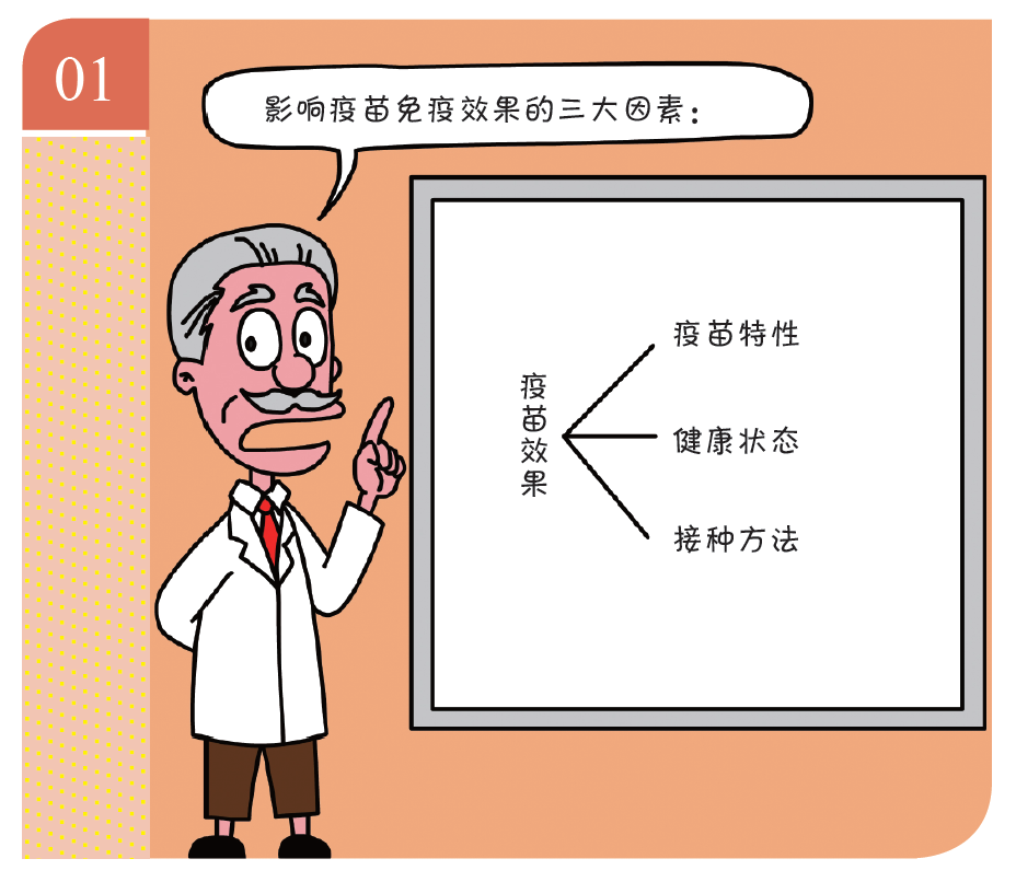 影响机体疫苗接种效果的因素主要有疫苗特性、受种者的健康状态和接种方法等。疫苗作用的基本原理是借助病原体的抗原作用于人体免疫系统,产生特异性免疫应答,并获得免疫记忆。由于不同病原微生物的感染途径、好发时间不同,接种人群的居住地区和年龄不同,因此不同疫苗接种的具体时间和程序也有一定差异。疫苗一定要按时、按程序接种。如果接种前出现感染等异常情况,需要及时向医生咨询。