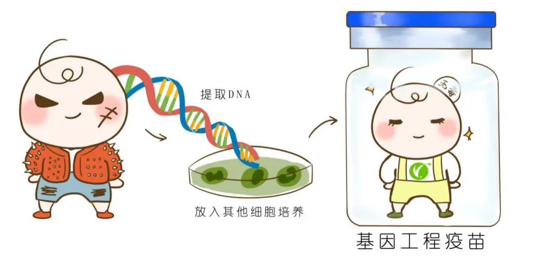 如果把我的 DNA/RNA 遗传物质提取出来,放入其他细胞中培养出来另一个无毒的“我”,这样制成的疫苗叫作基因工程疫苗。