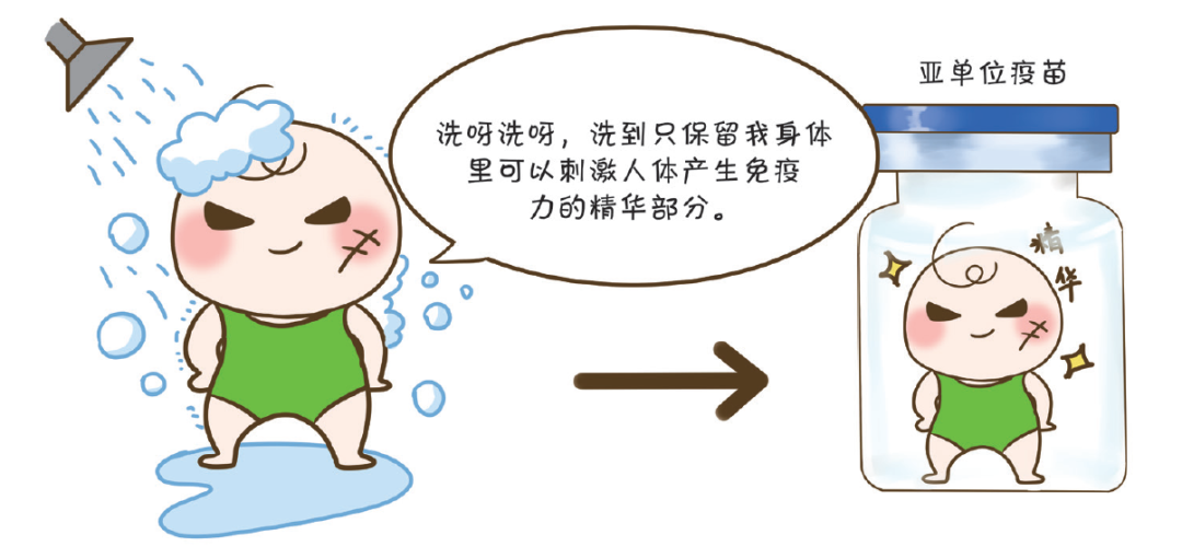 如果把我身体里与刺激人体产生免疫力无关的成分去掉,仅留下刺激免疫力的有效成分,用这些有效成分制成的疫苗叫作亚单位疫苗。