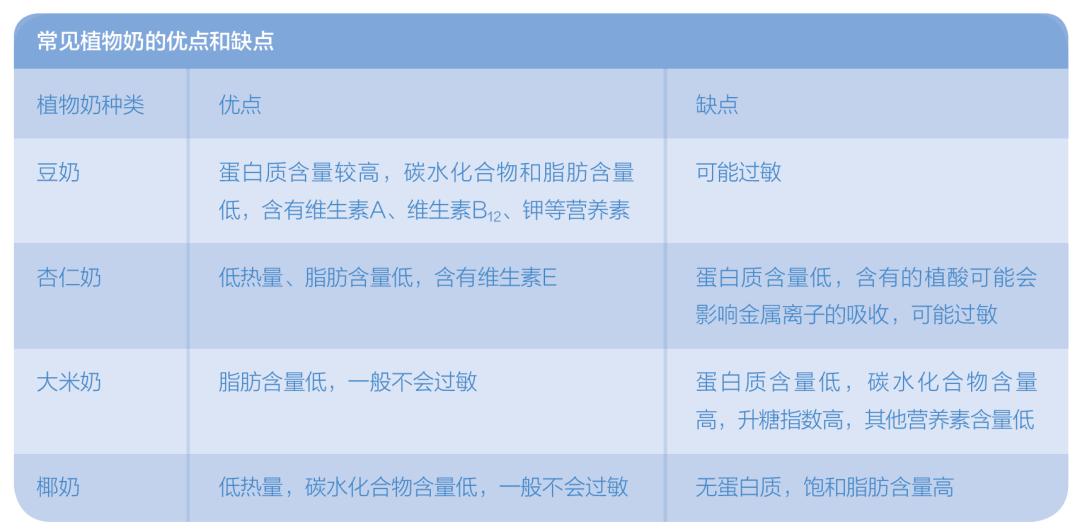如果需要控制热量或者是素食者,可以选择植物奶来替代牛奶,但是要注意从其他食物中增加一定蛋白质的摄入,同时注意选购添加了维生素D和钙的产品。