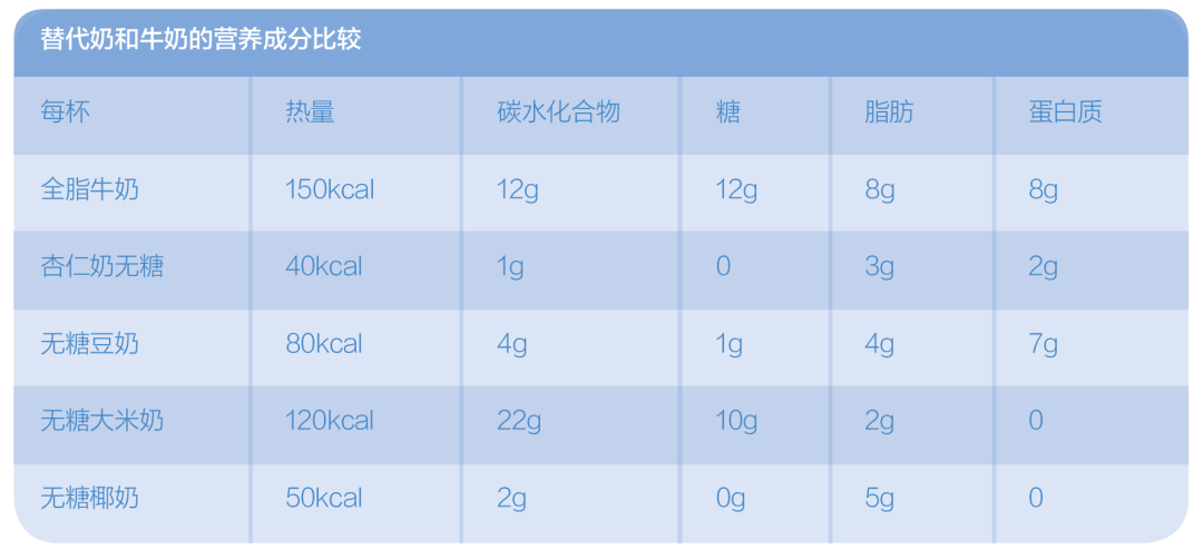 有很多人会选用这些奶来替代早餐中的牛奶,或者用这些奶来做咖啡,如豆奶拿铁、杏仁奶摩卡之类。这些奶实际上是植物来源的,营养成分和真正的牛奶相比还是有差距的。