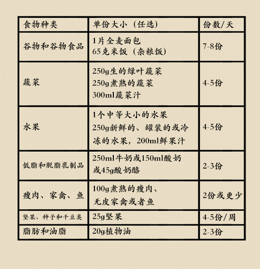 记住一天的总值,只要我们吃的东西不超过总份数,就可以了!至于吃什么,自由搭配即可!