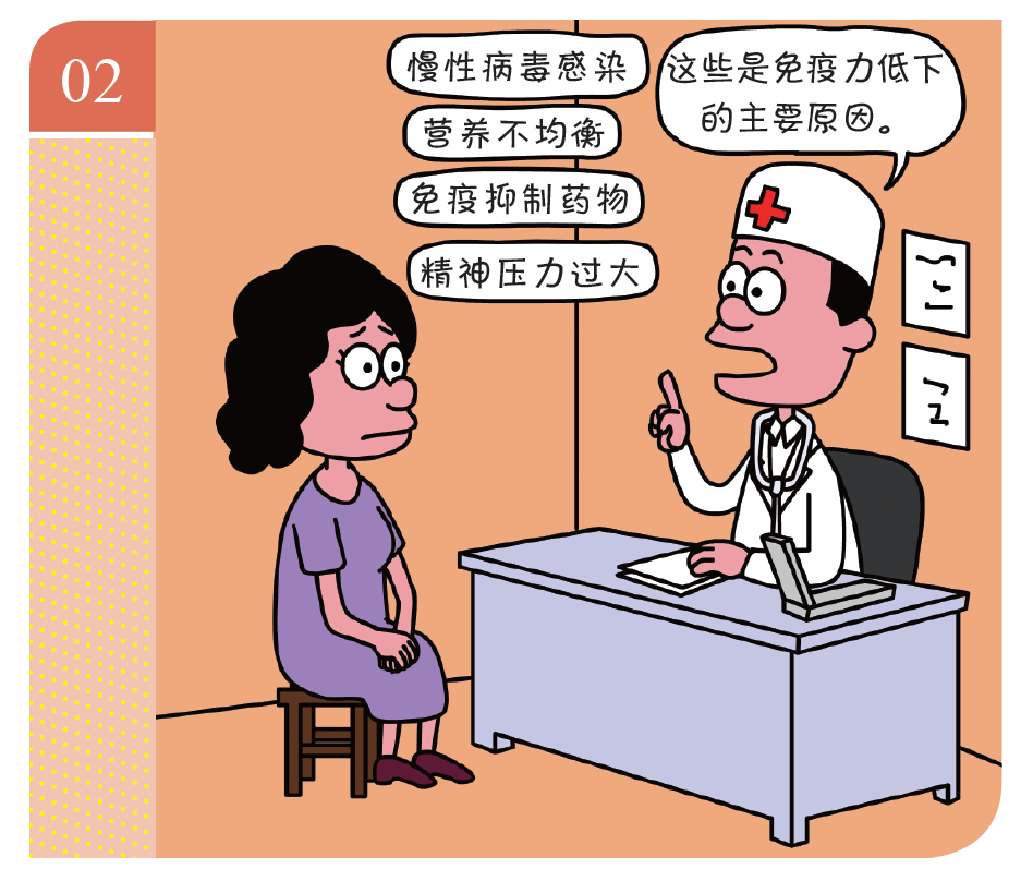要明确免疫力低下的原因,才能有针对性地采取措施,包括用药或建立良好的生活习惯。除一些免疫缺陷疾病或长期应用免疫抑制药物治疗的患者外,普通人群中常见原因还包括:婴幼儿与老年人的免疫反应低于年轻人;营养不均衡、肠道菌群失调、不良情绪及应激状态等、长期精神压力过大等因素。