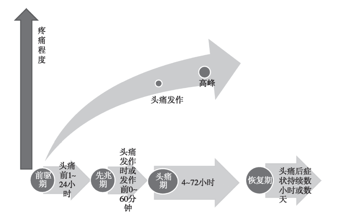 发作之前可有看东西出现闪光性暗点、暗点逐渐扩大、视野变形、短暂失语、头晕、畏光、口齿不清、苍白、寒战、震颤、单侧麻木无力等单一或联合出现的先兆症状,可持续数分钟至1小时。
