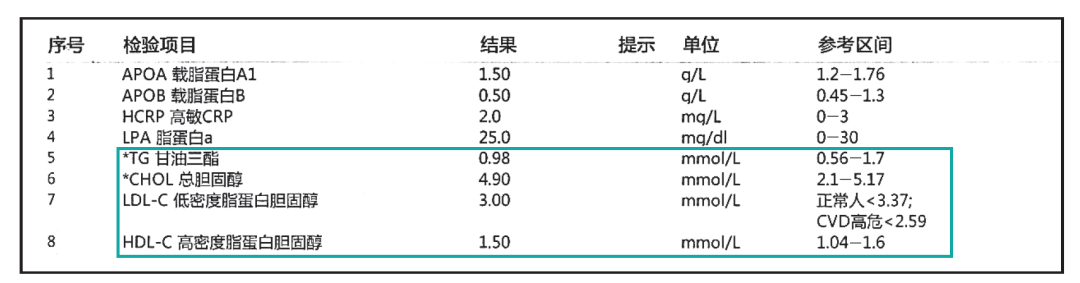 举个例子,一个患者拿到自己的血脂化验单之后,LDL-C 检测结果是3.00mmol/L,低于3.37mmol/L(正常人范围< 3.37mmol/L),就认为自己血脂水平完全正常,这是不合适的,因为还要看其自身的情况,如果他还有冠心病或脑血管病,或家族有心脑血管病史,他的血脂显然不能只控制到小于3.37mmol/L 就行,需要控制到更低的水平2.59mmol/L。