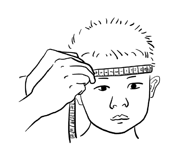 让小儿立位、坐位或仰卧位,爸爸(妈妈)站立于或坐于小儿前面或右面,用左手拇指将软尺零点固定于头部右侧齐眉弓上缘处,软尺从头部右侧经过枕骨粗隆最高处而回至零点,读出数值即为头围。测量时需注意软尺应紧贴皮肤,左右对称,长发者应先将头发在软尺经过处向上下分开。