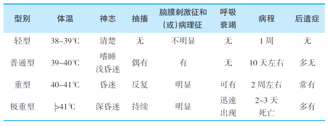 乙脑临床上根据病情轻重的不同,可分为4种类型:轻型、普通型、重型、极重型。