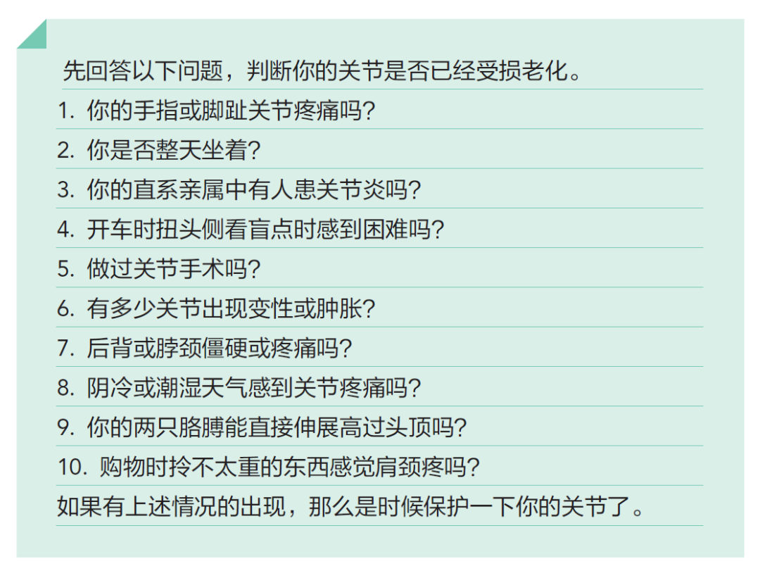 后四项我们可以通过控制体重、加强安全措施、多休息以及保暖等方式避免关节受损,唯独老化是无法避免的。