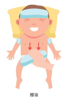 温水擦浴。用低于病人体温的温水毛巾反复轻轻擦拭大血管走行处如颈部两侧、腋窝下、腹股沟(大腿根部)等处,使之皮肤发红,以利散热。以32~34℃为宜。擦拭时, 力度均匀,轻轻按摩以促进血管扩张散热。擦浴后应将身体擦干,及时穿好衣服。擦浴顺序为:双上肢、背部、双下肢。