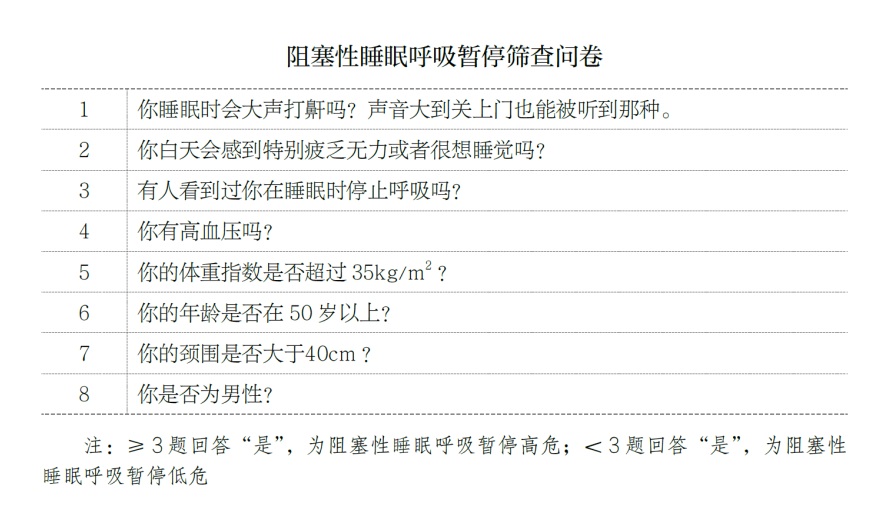 如果你有肥胖、家族史、长期吸烟、长期大量饮酒或服用镇静剂这些危险因素,并且睡眠过程中鼾声不规律,白天比较困倦,可以做一做下面这个问卷:其中包含8个问题,如果你对3个或以上的问题答案为“是”,说明你患上阻塞性睡眠呼吸暂停的风险为高危。