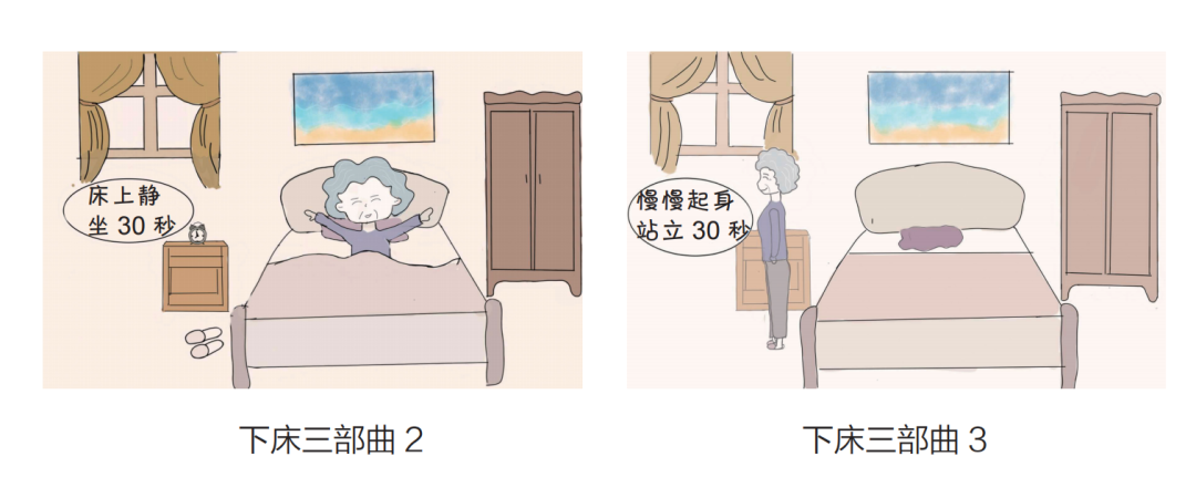 2. 坐位 30 秒:慢慢起身,床上静坐 30 秒,此时可以抬抬胳膊、耸耸肩,然后将双脚移至床沿;