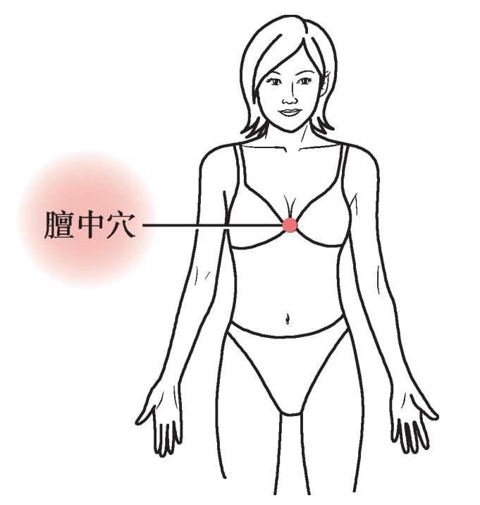 只要在生气后对着膻中穴向下捋 100 次左右,即可起到顺气的作用。按摩此穴,有宁心神、宽胸除闷等作用。
