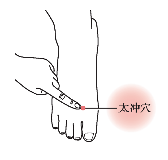 是肝经自身的一个非常有名的“撒气穴”,用左手拇指或示指指腹按揉右侧太冲穴 1 分钟,按揉时以有酸胀感为宜,按揉完右侧太冲穴,再换右手拇指或示指指腹按揉左侧太冲穴 1 分钟。此穴对爱发火者和郁闷者都有很好的舒缓作用。