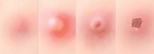 我的样貌一点都不可爱,甚至还有些令人害怕。首先,我是红色斑疹,数小时后变成丘疹,最后变成疱疹,过程中常伴随瘙痒。1~2天后,疱疹从中心开始干枯、结痂,1周后痂皮开始脱落,一般不留瘢痕。皮疹呈向心性分布,主要发生在胸、腹、背,四肢很少。