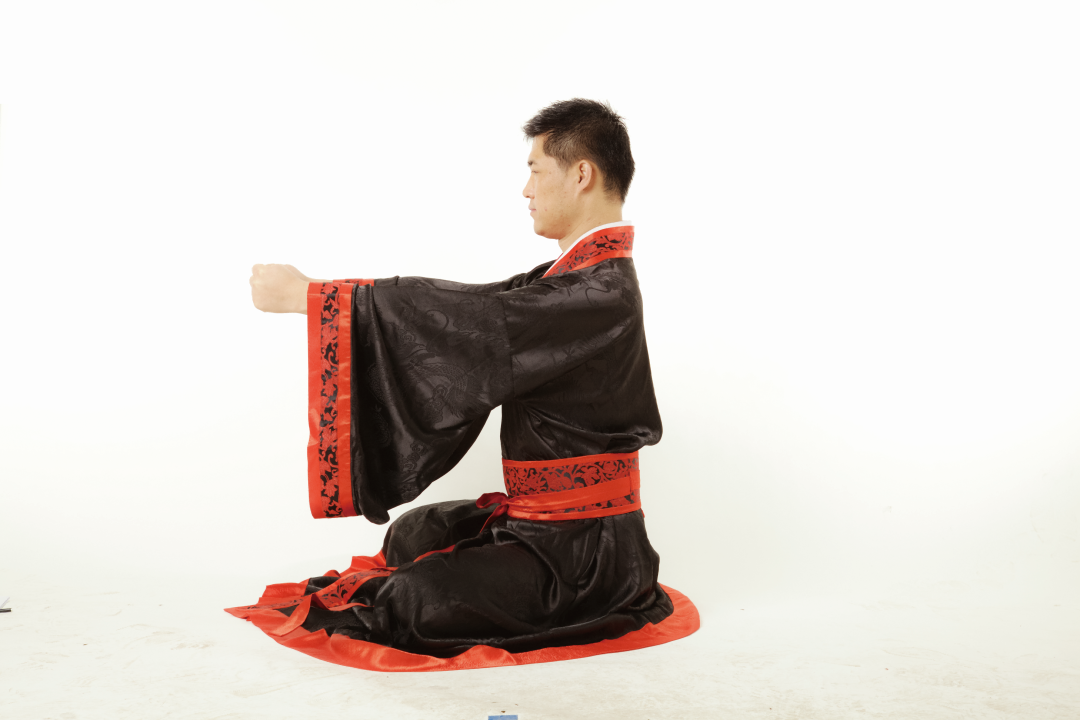 ● 3. 接上式,拇指内屈轻抵无名指根,再将其余四指依次屈拢“握固”成拳,同时两臂外旋,屈肘收臂,置于身体两侧,拳眼向上,拳心相对,目视前方,动作略停。