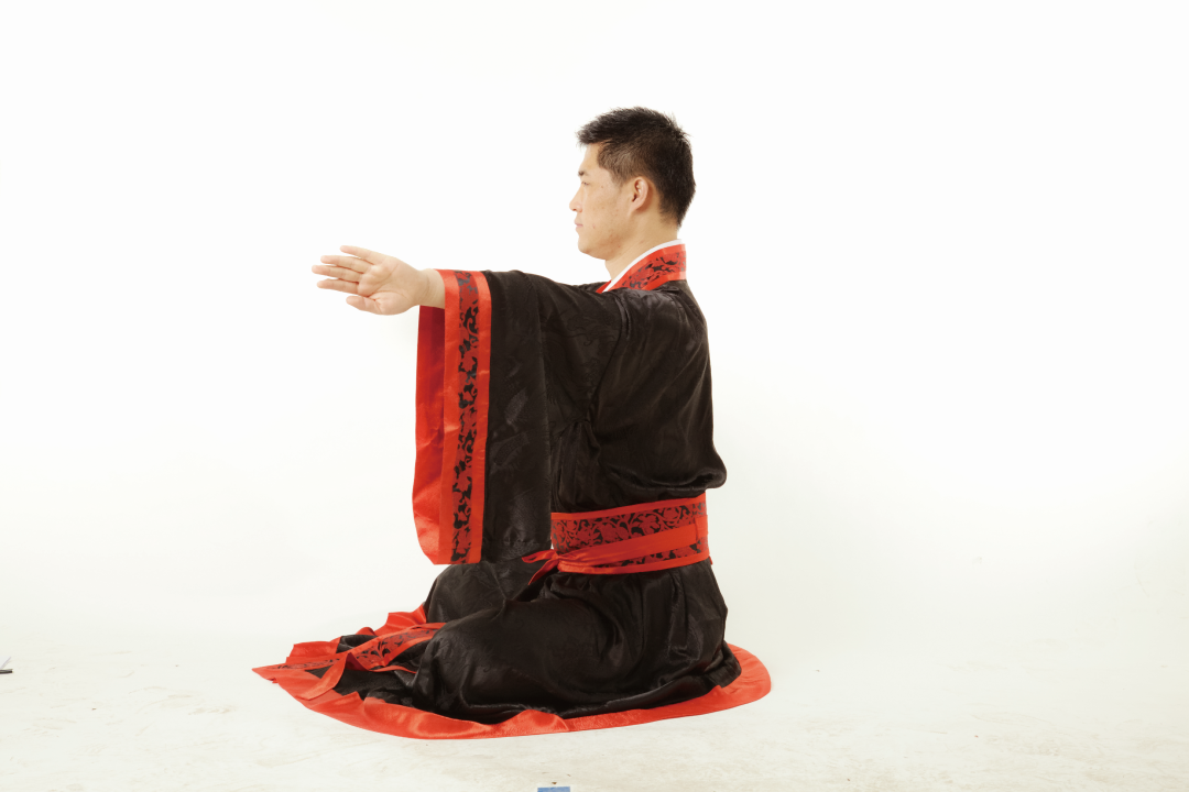 5.两臂前伸,体会两臂如两条直线;下巴内收、百会上顶,体会脊柱犹如一条直线。